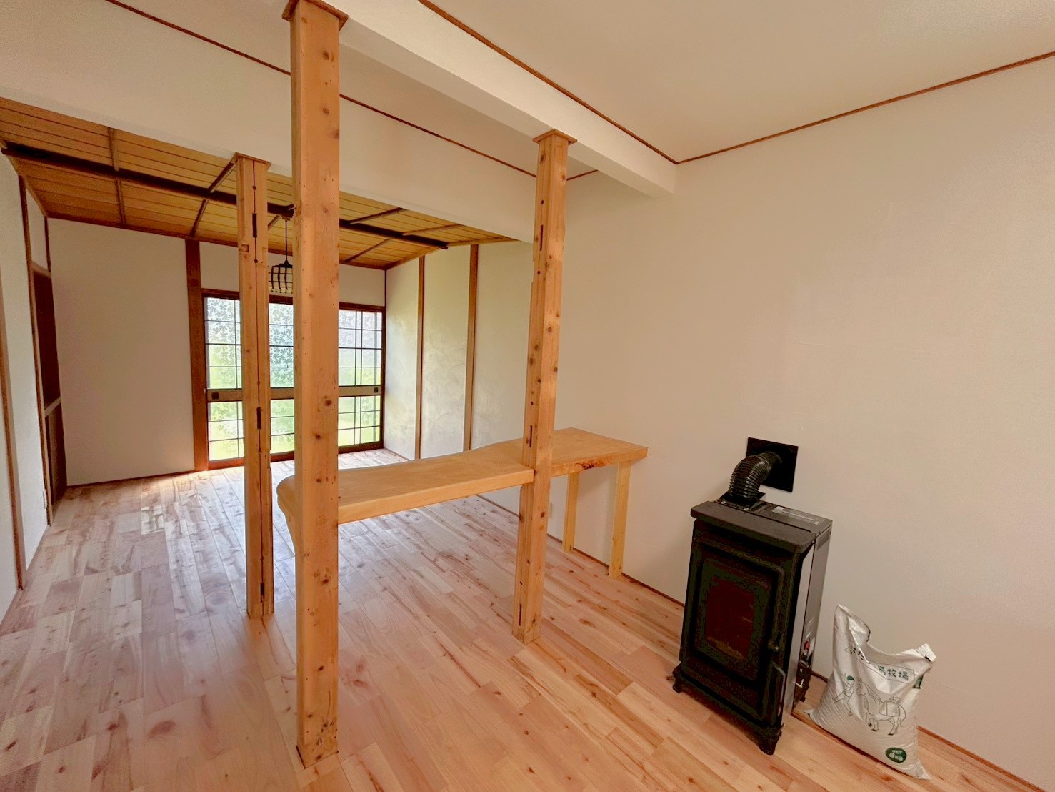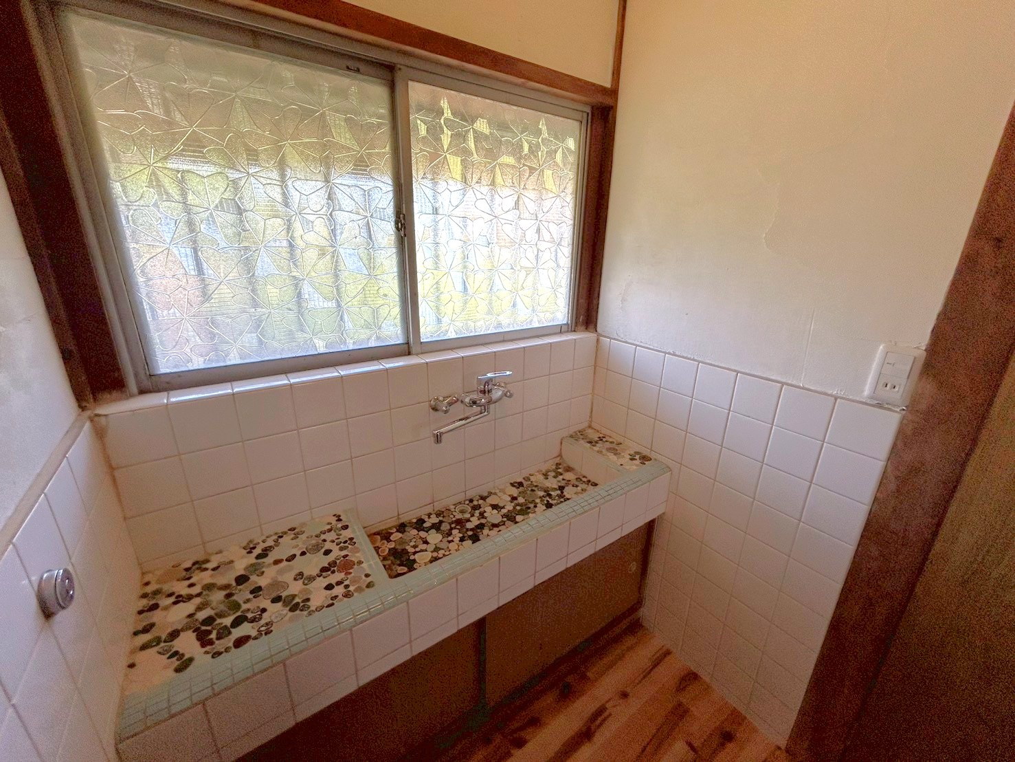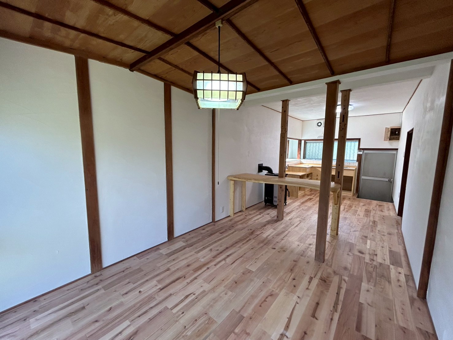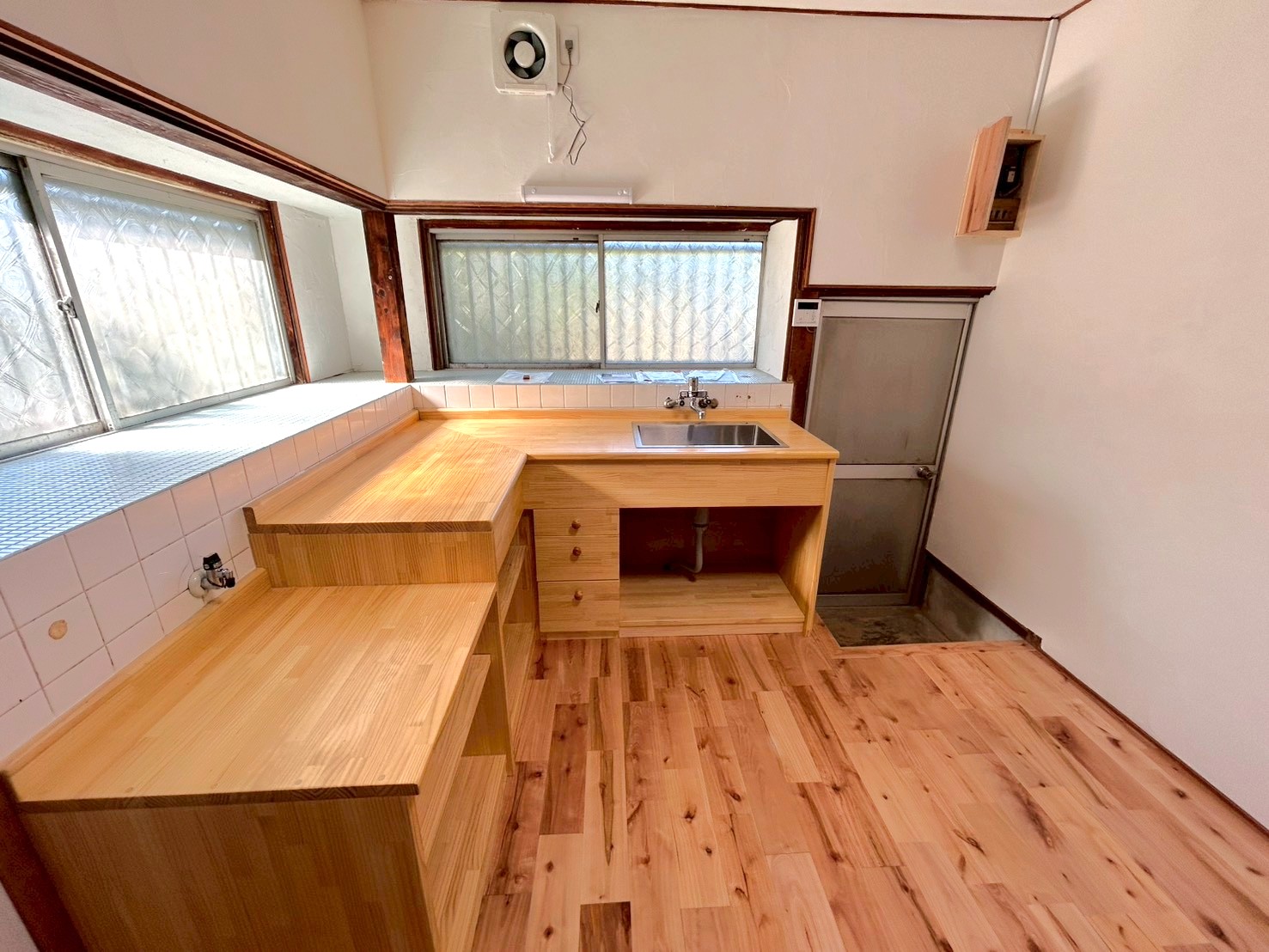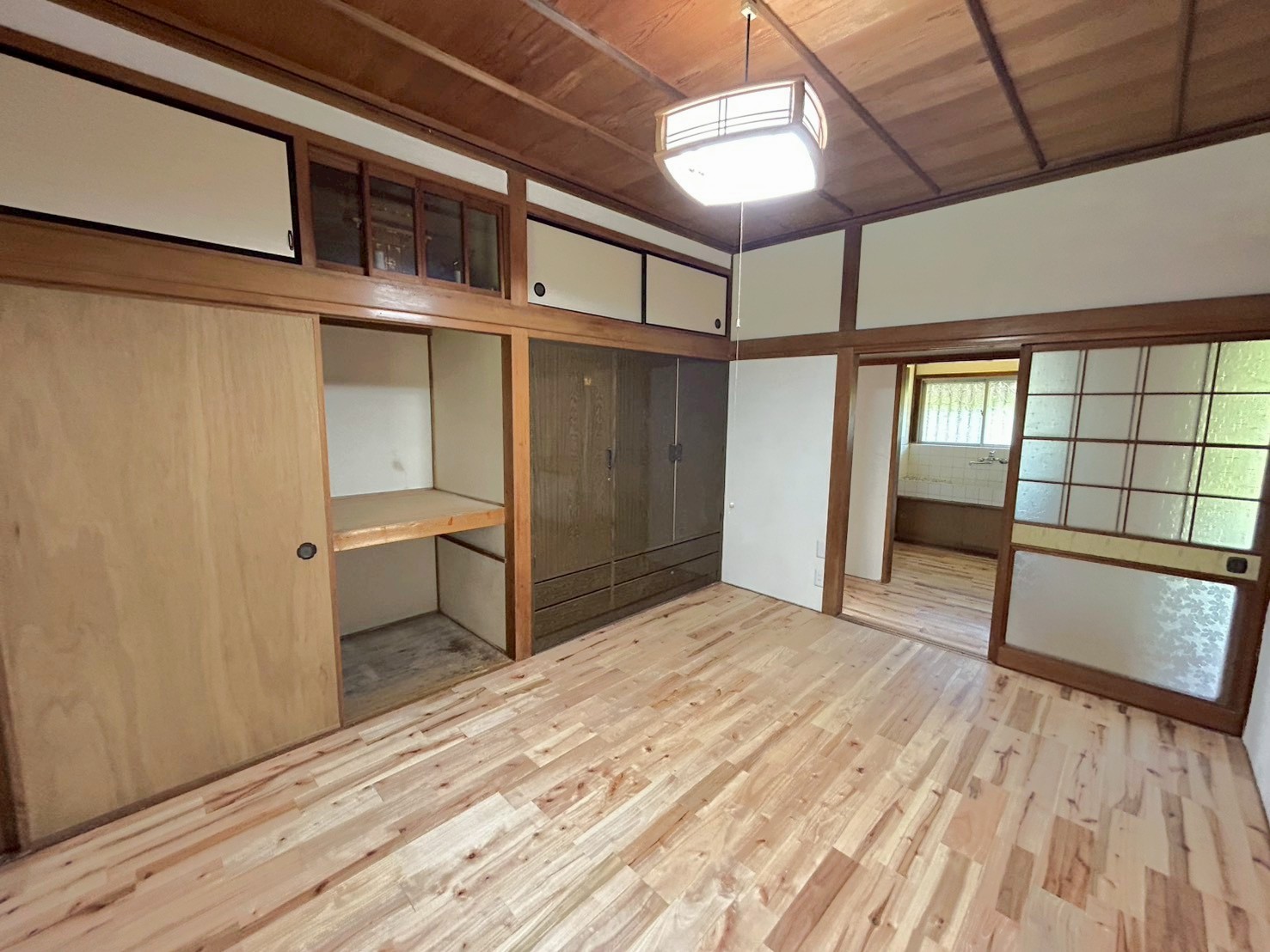 ②洗面所、全室無垢フローリングへ変更(明るい色のサクラのフローリングを使用)
